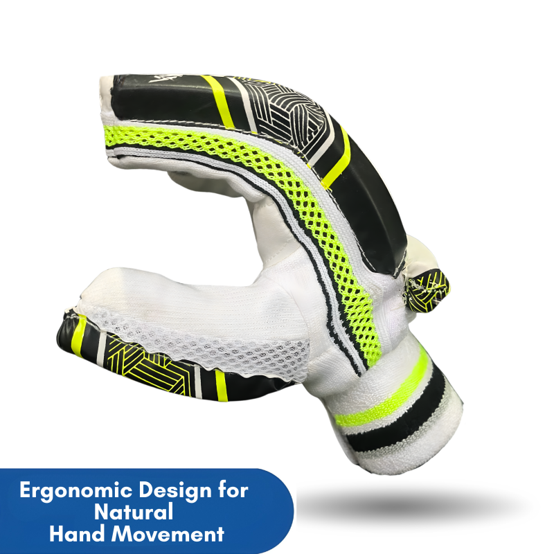 The textured synthetic palm ensures good bat grip and control, while high-density foam padding across the fingers and backhand helps absorb minor to moderate impacts. Designed for early-stage players, the County model includes breathable mesh panels and a snug-fitting elastic wrist strap for long-wear comfort.