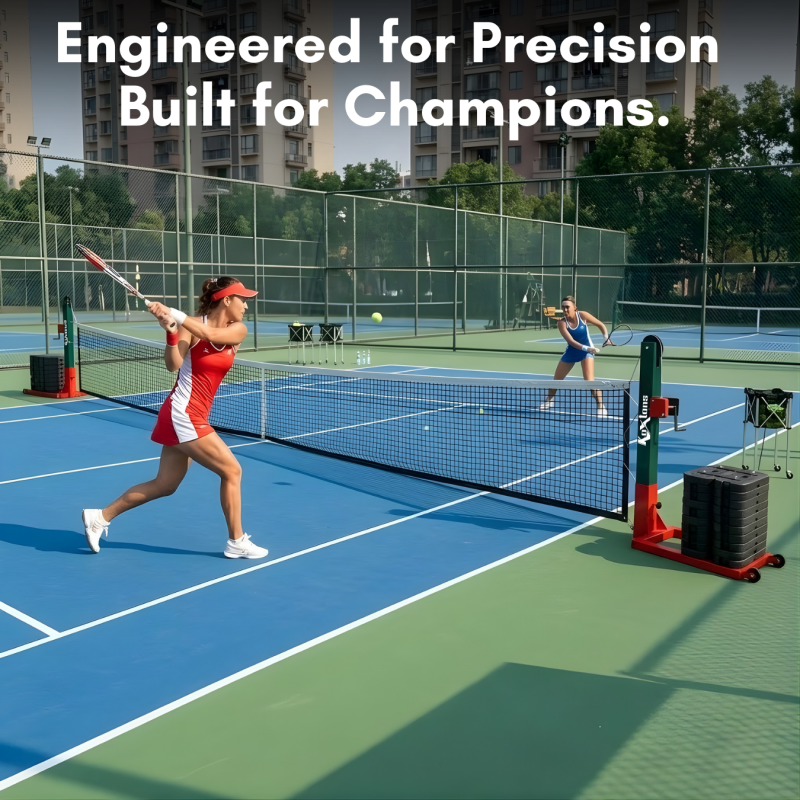 The post is equipped with a smooth ratchet mechanism for secure net tensioning and features a balanced movable frame to shift courtside as needed. This model blends superior performance with practical functionality.