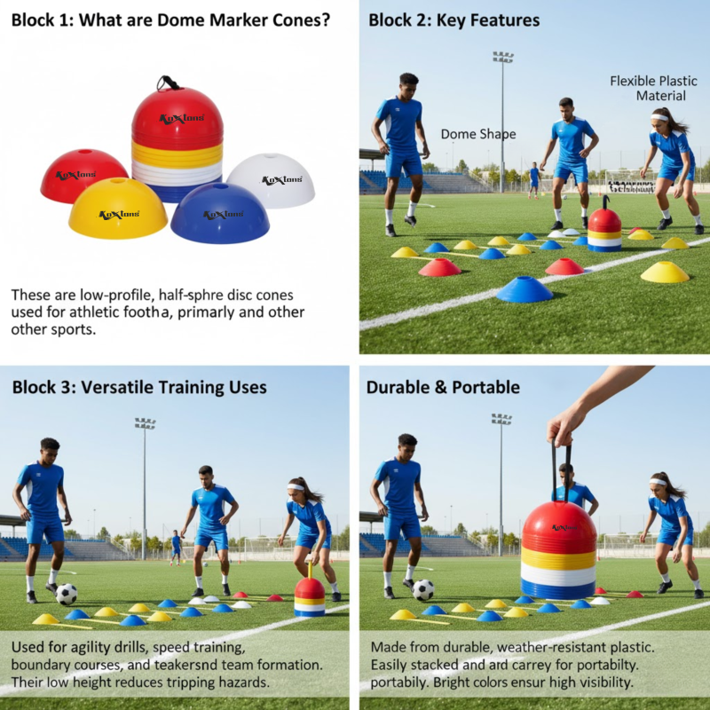 "I use these dome marker cones regularly for team soccer practice. The soft material eliminates any concern about injury, and the bright colors make them easy to see, even on misty mornings! A must-have for any coach."