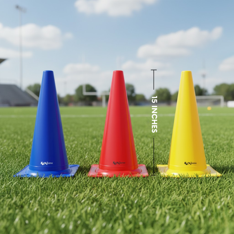 "These cones are great for marking boundaries during our football drills. The 15" size is ideal for outdoor use, and the soft plastic makes them safe during fast-paced activities. The only reason I’m giving them 4 stars instead of 5 is that they are a little bulky for indoor use, but they work perfectly outside."