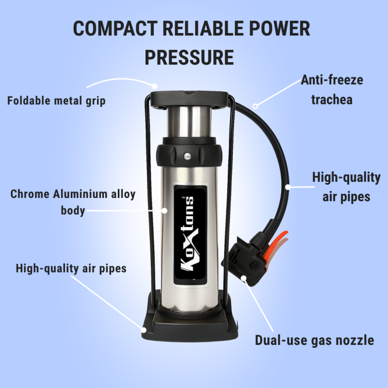 The Koxtons Footpump for Bicycle – Silver is made for quick and hassle-free tire inflation. Crafted from premium aluminium, it offers long-lasting strength while staying lightweight and easy to carry anywhere.